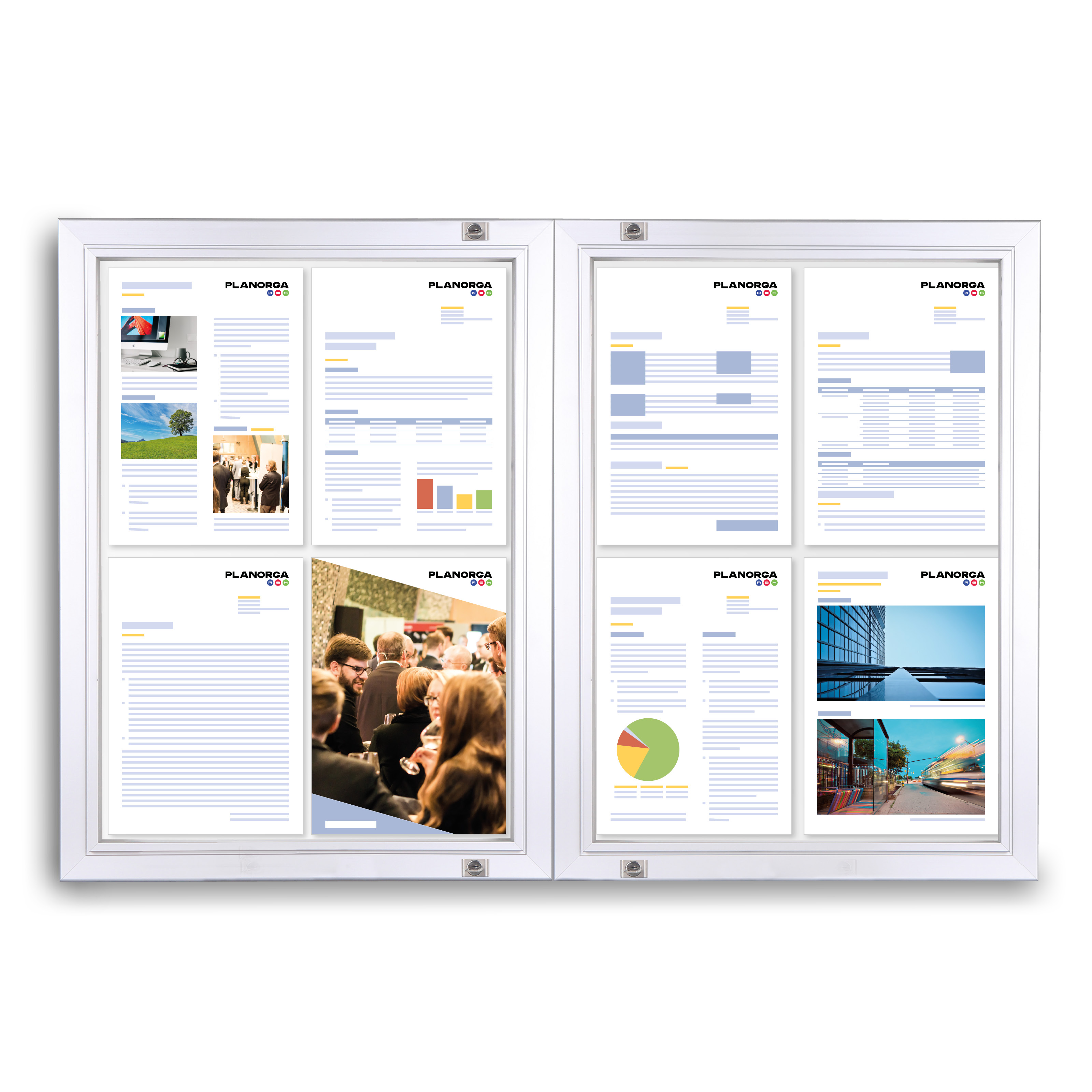 Dwudrzwiowa gablota Classique to doskonałe rozwiązanie do eleganckiej i bezpiecznej prezentacji informacji na zewnątrz. Dzięki solidnej konstrukcji oraz zastosowanym materiałom, gablota łączy funkcjonalność z estetyką, oferując trwałość i wygodę użytkowania. Produkt został zaprojektowany z myślą o efektywnym eksponowaniu dokumentów, ogłoszeń lub innych treści, które mają pozostać widoczne i chronione w każdych warunkach atmosferycznych.