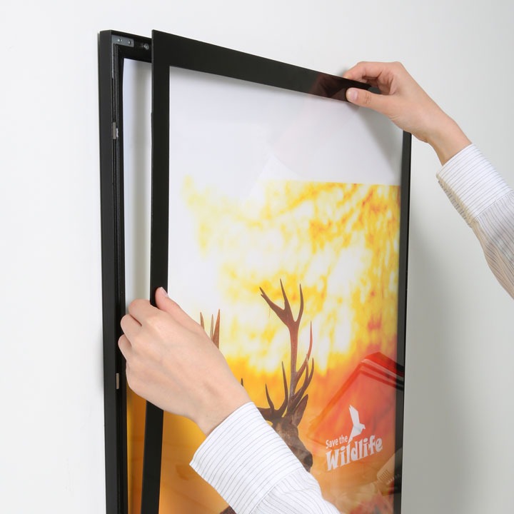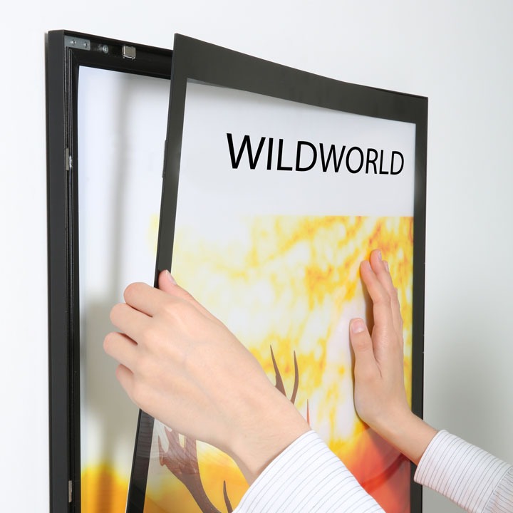 Jedną z największych zalet tej ramki jest zastosowanie magnetycznej osłony ochronnej, która umożliwia szybką i wygodną wymianę grafiki – bez użycia narzędzi i bez ryzyka uszkodzenia plakatu. Wystarczy unieść front ramki, umieścić nowy wydruk i zamknąć – magnesy automatycznie i bezpiecznie przytrzymają osłonę w odpowiednim miejscu.