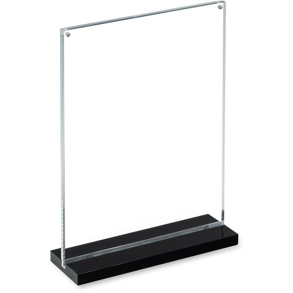 Stojak Vista to elegancki stojak wykonany z wysokiej jakości akrylu. Jest wytrzymały, posiada szeroką, czarną podstawę, która zapewnia stabilność oraz stylowy wygląd. Jego dwustronna konstrukcja pozwala na jednoczesne wyeksponowanie dwóch różnych grafik.