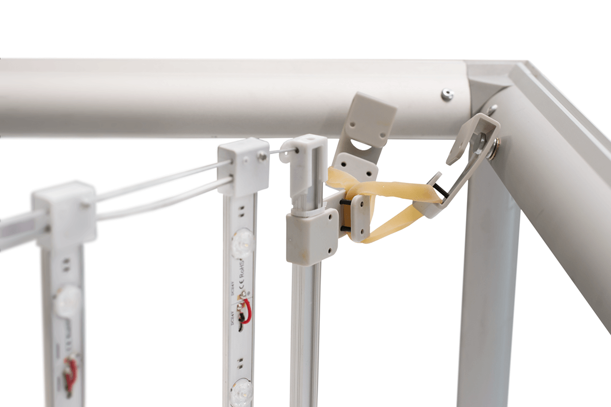 Grafika do kostki wykonana jest z tkaniny poliestrowej, która umożliwia nadruk sublimacyjny. Jest to materiał trwały, odporny na zagniecenia i łatwy w utrzymaniu. Dzięki systemowi SEG tkanina z nadrukiem łatwo wsuwa się w rowki aluminiowej ramy, zapewniając gładką i profesjonalną powierzchnię reklamy.