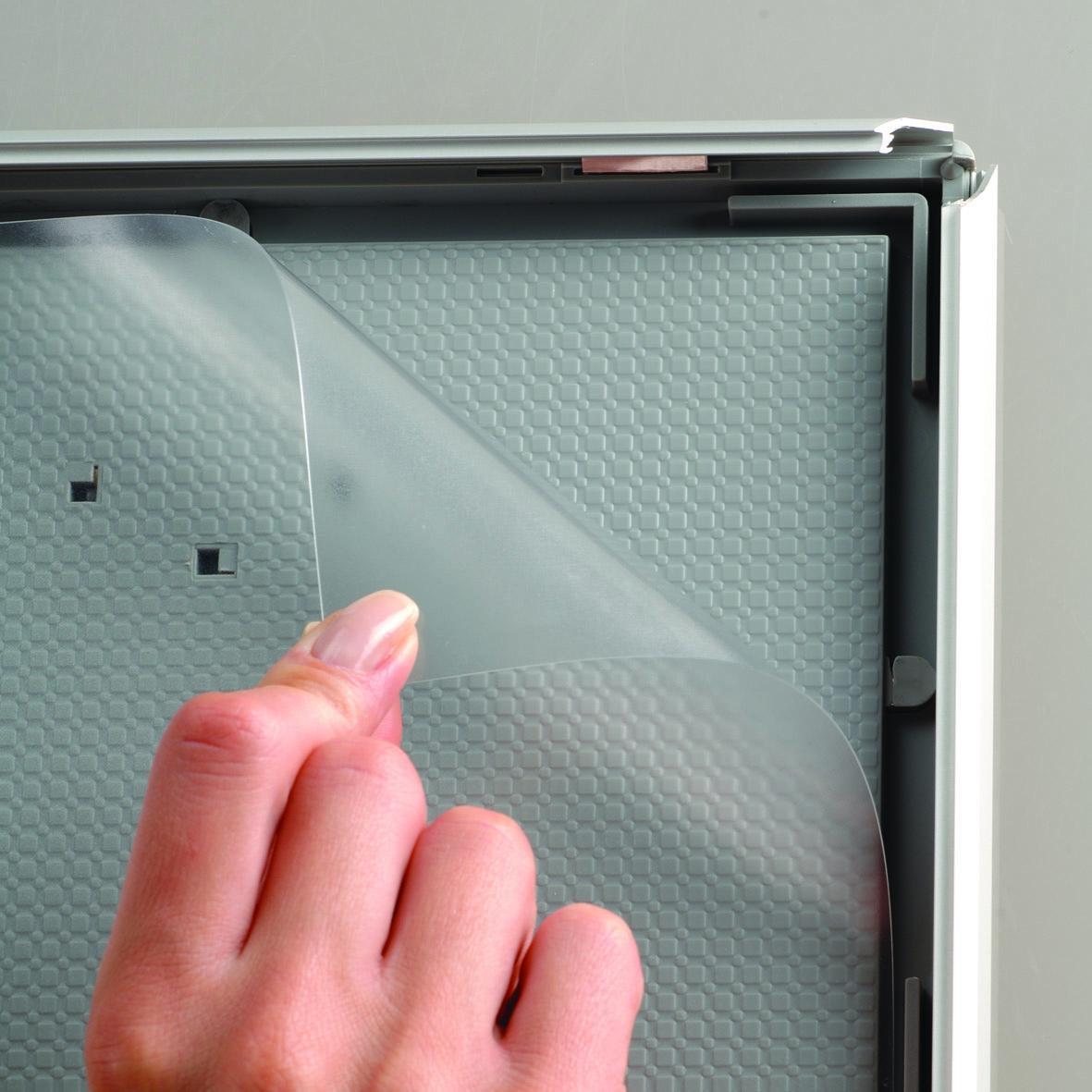 Dzięki systemowi OWZ, wymiana materiałów w ramie jest bardzo prosta i szybka, bez potrzeby zdejmowania jej ze ściany. Wystarczy otworzyć cztery krawędzie ramy i wymienić plakat lub grafikę.