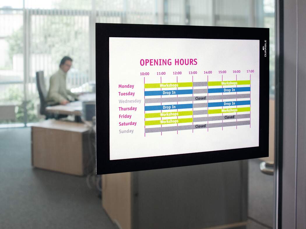 Dzięki prostemu mechanizmowi zmiany treści, wystarczy odchylić ramkę, wymienić kartę informacyjną i zamknąć - wszystko za sprawą magnesów. Umożliwia to wielokrotną wymianę zawartości, co sprawia, że jest idealna do prezentacji informacji, które wymagają częstej aktualizacji.