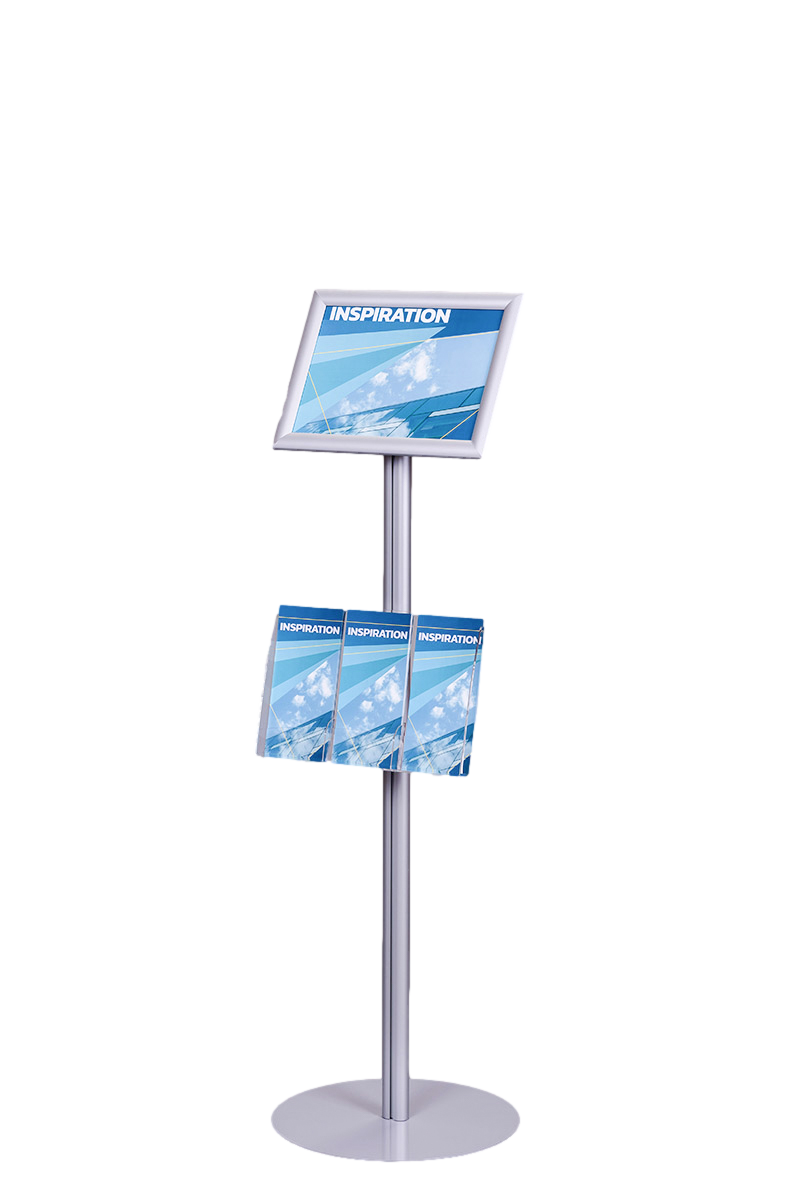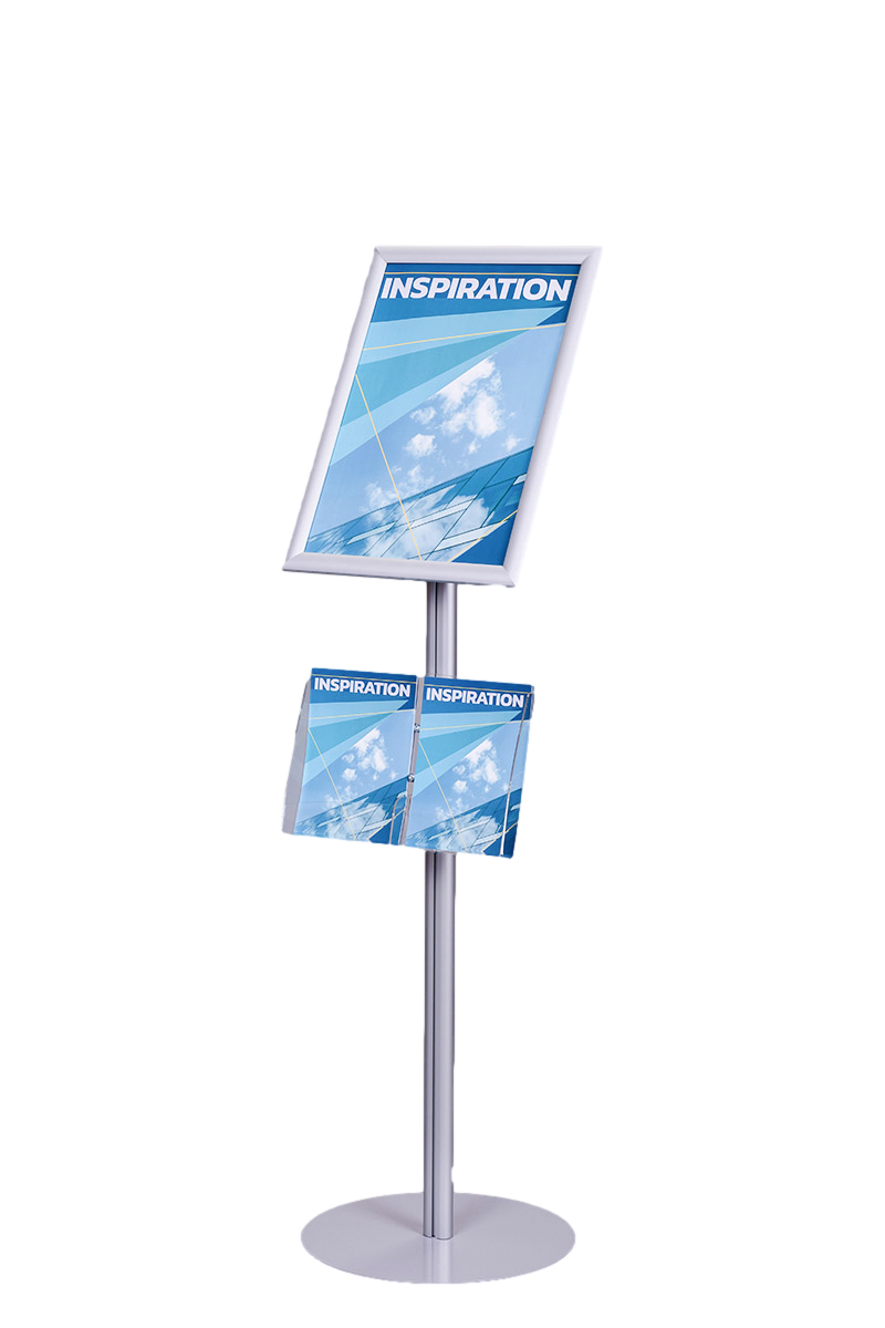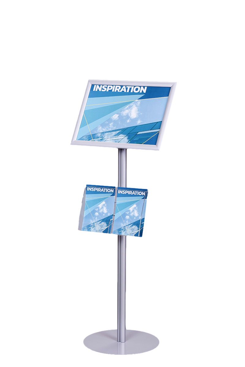 Na szczycie stojaka znajduje się rama zatrzaskowa OWZ o profilu 25 mm, dostępna w formatach A4 lub A3, która umożliwia szybkie i łatwe zmiany treści dzięki systemowi otwórz-włóż-zamknij. Proste narożniki nadają całości elegancki charakter. Plakaty są chronione przez folię antyrefleksyjną o grubości 0,5 mm, co zabezpiecza je przed kurzem i zarysowaniami oraz minimalizuje odbicia światła, poprawiając czytelność.