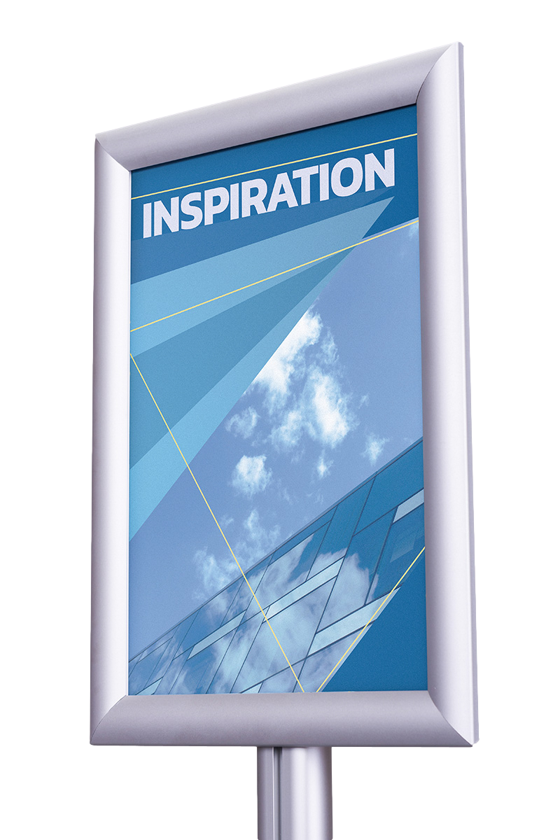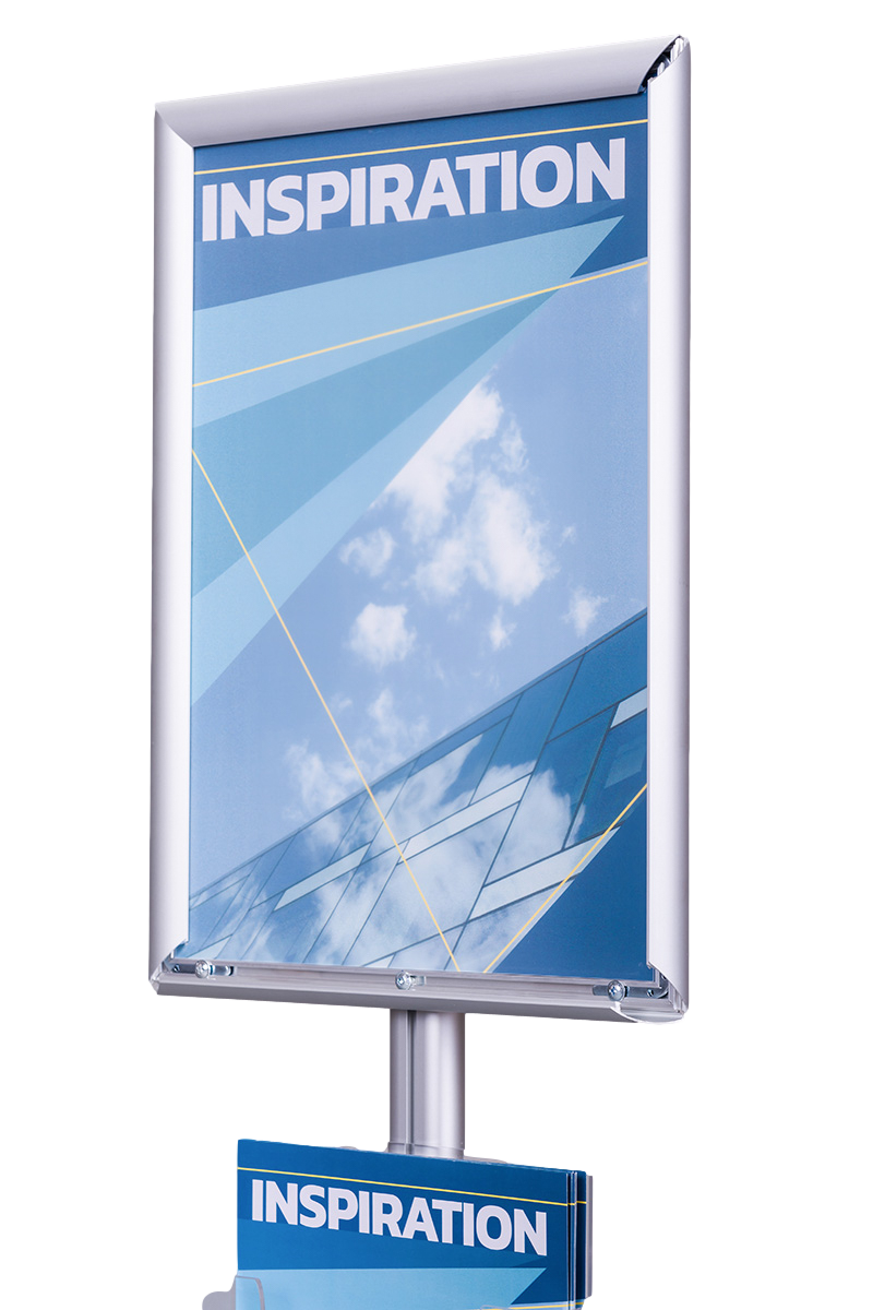Stojak wykonany jest z wysokiej jakości anodowanego aluminium, a jego podstawa metalowa jest lakierowana proszkowo, co zapewnia trwałość i odporność na uszkodzenia. Na szczycie stojaka znajduje się rama zatrzaskowa o profilu 25 mm z prostymi narożnikami, dostosowana do formatów A4 i A3, którą można ustawić zarówno w orientacji pionowej, jak i poziomej. Zabezpieczenie plakatu stanowi folia antyrefleksyjna o grubości 0,5 mm, co gwarantuje wyraźny widok bez odbić światła.